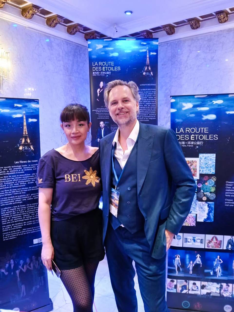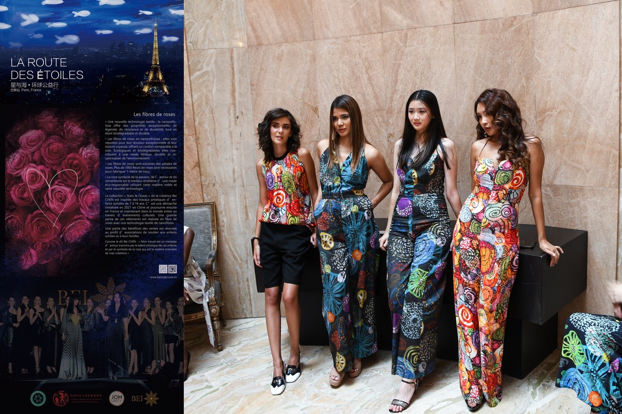 Ce 23 et 24 août, Bei Chen a participé au Salon des Entrepreneurs aux Salons Hoche à Paris. L’Association Jom Unity et son Président Guillaume Rat ont parrainé cet événement exceptionnel. La collection Stars & Océan met en lumière les sublimes dessins des enfants autistes sur des tissus en fibre de rose, innovation technologique majeure qui va dans le sens du bien !