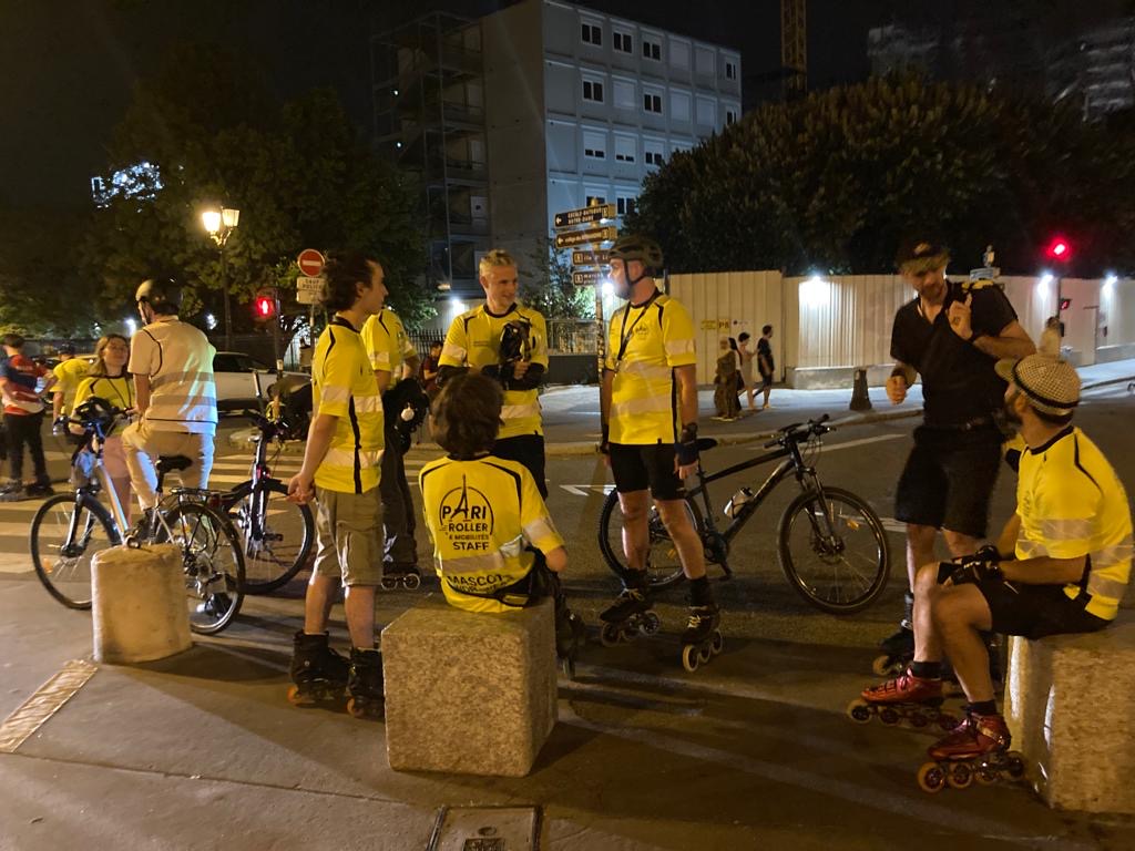 Fathi, Martin, le grand Antoine et Antoine… Pour le plaisir, ils staffent. Giovanni, Josef, Les Louis… Pour notre sécurité, ils staffent. Ils… Omarou, Clément et Victor et elles… Orlanne, une bombe en roller, fan de la Suède et Coralie, une flèche au vélo illuminé toujours loin devant, sont jeunes et passionnés. Parfois, ils sont moins jeunes. Pour connaître l’âge de notre vétéran staffeur, il faut savoir sa table de multiplication de 9. Tous s’impliquent, se responsabilisent, s’engagent. Si l’on peut rouler, traverser des boulevards sans être inquiéter, si l’on peut envahir des avenues, s’approprier les quais de Seine, c’est grâce à eux. Ils sont bénévoles. Ils staffent gratos ! La rando Pari Roller c’est les staffeurs ! Sans eux, pas de rando ! À leur corps défendant, ils retiennent les voitures impatientes, les taxis injurieux, les motos vrombissantes. Ils nous protègent. Ils jouent de leur courtoisie et diplomatie pour stopper la circulation le temps que l’on passe tous, jusqu’au dernier, jusqu’à l’ambulance qui ferme de cortège. Les staffeurs ont en commun le goût et la pratique de la glisse. Outre qu’ils maîtrisent, il faut ajouter qu’ils ont en eux quelque chose du Bon Samaritain, entièrement dévoués à cette idée de nous reconduire au point d’arrivée dans le même état que nous étions au départ. Un immense merci à Franck et à tous les autres, vous me pardonnerez, je ne vous connais pas tous.