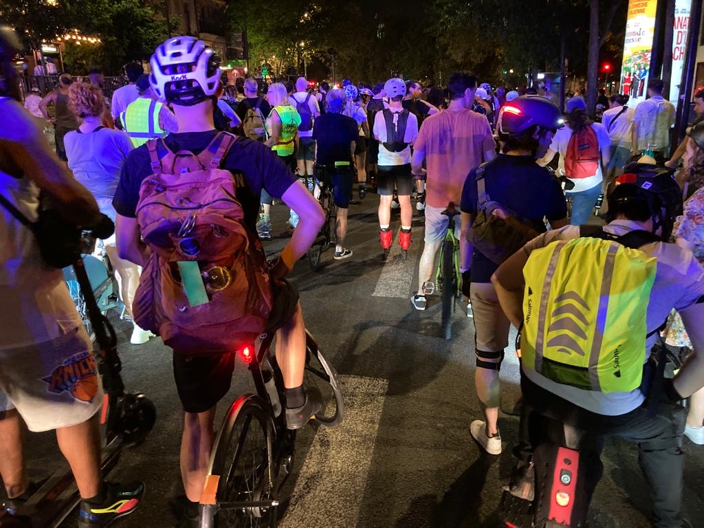 Jamais lassés, les parisiens et les touristes toujours surpris photographient cet étrange cortège mobile qui, au début, peine à trouver son tempo de la soirée. D’abord la voiture d’ouverture, une Ford électrique derrière laquelle on peut respirer, suivie par les éclaireurs, puis les staffeurs mobiles qui feront les prises de relais à toutes les intersections. Et voici la première ligne. Celle des staffeurs-meneurs. Chasuble rouge au centre. Chasubles jaunes sur les côtés. Imaginez leur rôle ! Conduire la rando et symboliser, par leur simple présence, une ligne « infranchissable », une frontière à ne pas doubler. Impératif ! Le cortège doit être derrière eux. Entre le début et la fin de la rando, plusieurs centaines de personnes suivent leurs consignes. Il s’agit d’être à la hauteur ! Puis, à leur suite, dans l’ordre d’entrée en scène, noblesse oblige… les rollers et tout le reste de la mobilité : les vélos, les trottinettes à pédale à l’ancienne, les trottinettes électriques, hier soir un skate, les gyro, les vélos cargo et parfois des fauteuils roulants !