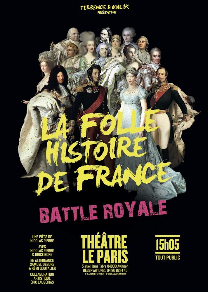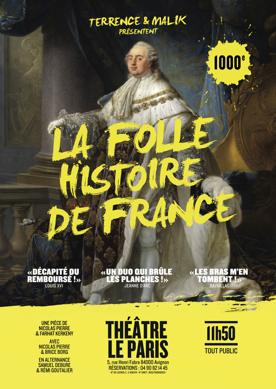 La Folle Histoire de France. Assistez au plus fou des cours d’Histoire avec le prof que l’on a tous rêvé d’avoir et le pire cancre du monde. Ici vous n’êtes pas au théâtre mais en classe et le prof accueille les spectateurs qui, le temps d’un cours d’histoire, redeviennent des élèves. Parmi eux, un cancre redoublant depuis 20 ans sa 5e ! Le prof va devoir déployer tout son talent et son savoir pour faire revivre l’histoire et lui donner l’envie d’apprendre. Sauf que plus il détaille les faits, plus le cancre va enchaîner les pitreries et plus l’histoire bascule dans la folie. Créé en 2013, le spectacle se joue depuis 10 saisons pour plus de 1000 représentations et revient pour la 6ème année consécutive au Festival OFF d’Avignon.