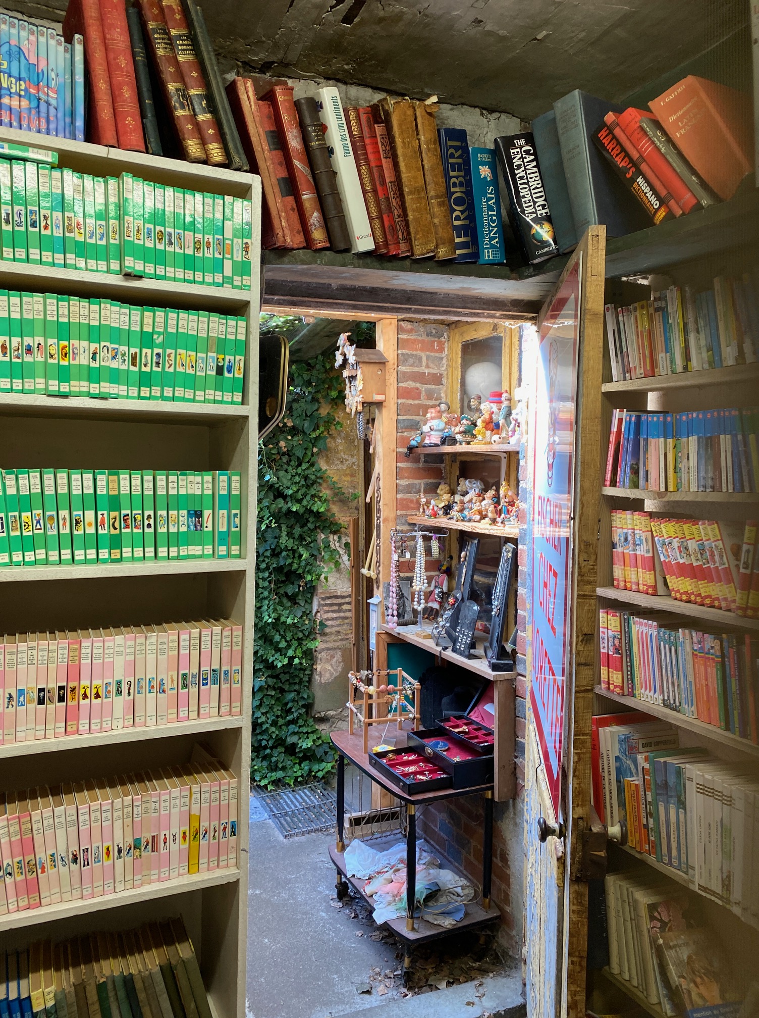 Et pourtant ce n’est pas mon coup de cœur principal à Saint-Sauveur-en-Puisaye. Non, mon coup de cœur c’est cette boutique de livres. Je n’ai jamais vu un tel amoncellement de livres, une telle quantité de travées chargées de milliers de bouquins, un tel labyrinthe de trouvailles. On marche, on tourne, on se retourne, on se croirait à Poudlard quand les escaliers changent de sens et que les tableaux aux murs s’animent. Mais où va-t-on ? Difficile même de trouver à qui payer ses achats ? Au fond, tout au fond, il y a même une brocante. J’aurais aimé avoir le temps de rester dans ces lieux entre livres et objets… Croyez-moi… Allez-y ! C’est une véritable institution conduite de mains d’expérimentés par deux bouquinistes passionnés.