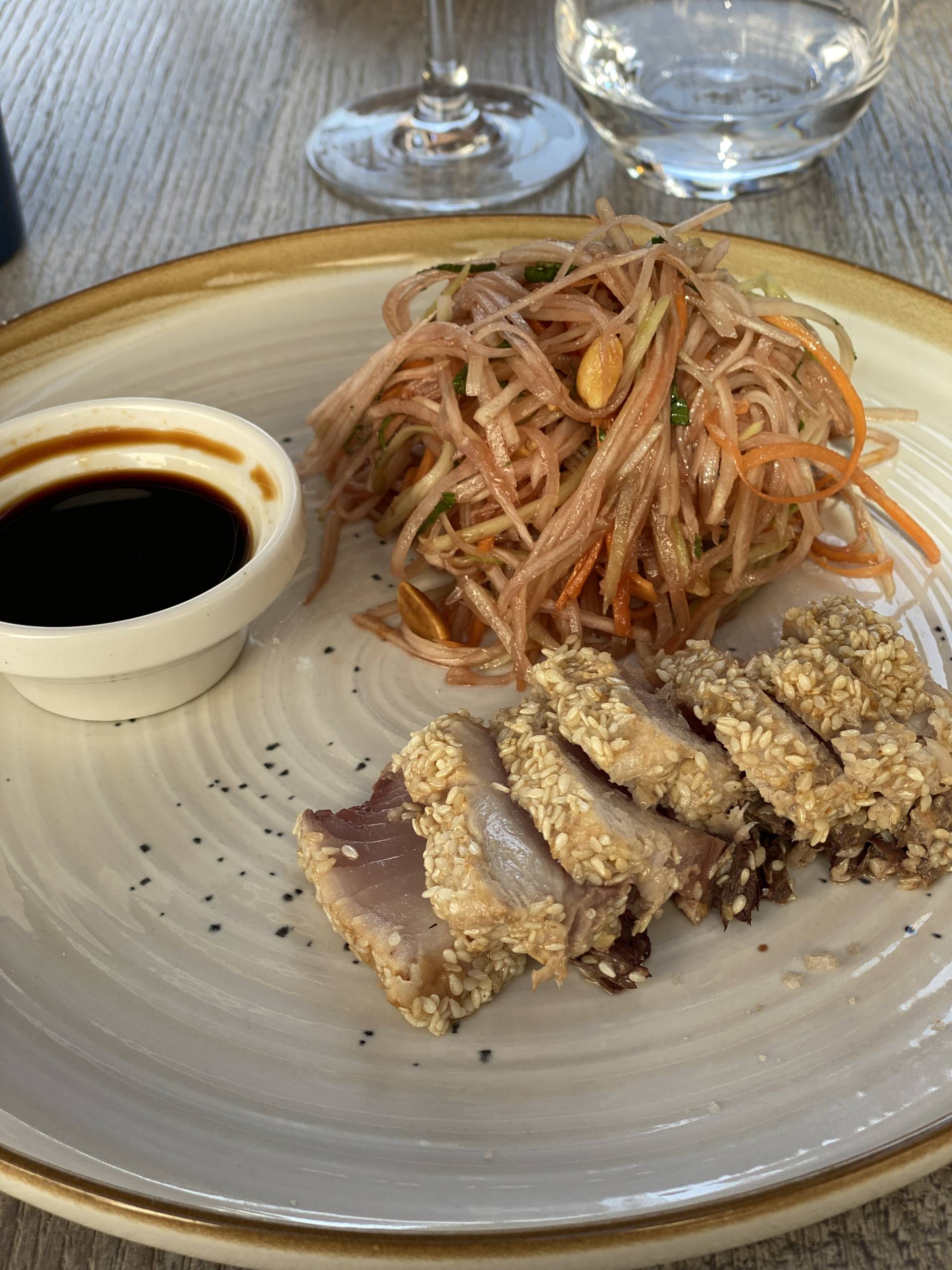 Dans la cour en sortant de la visite, se trouve un petit restaurant. On peut déguster des vins et manger à l’intérieur (peu de place) ou à l’extérieur (dans une belle cour). A mon sens, les prix de la carte sont trop élevés, mais le cadre justifie peut-être cela.