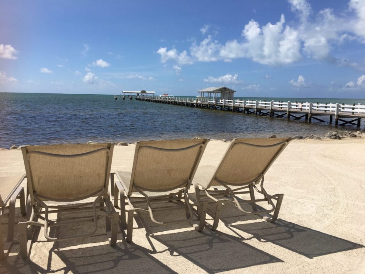 - Transat sur la plage privée du Cheeca Lodge. À droite le ponton d’où l’on voit Barracudas, Lamentins et requins marteaux. Encore plus à droite, la « célèbre plage » de la série Bloodline.