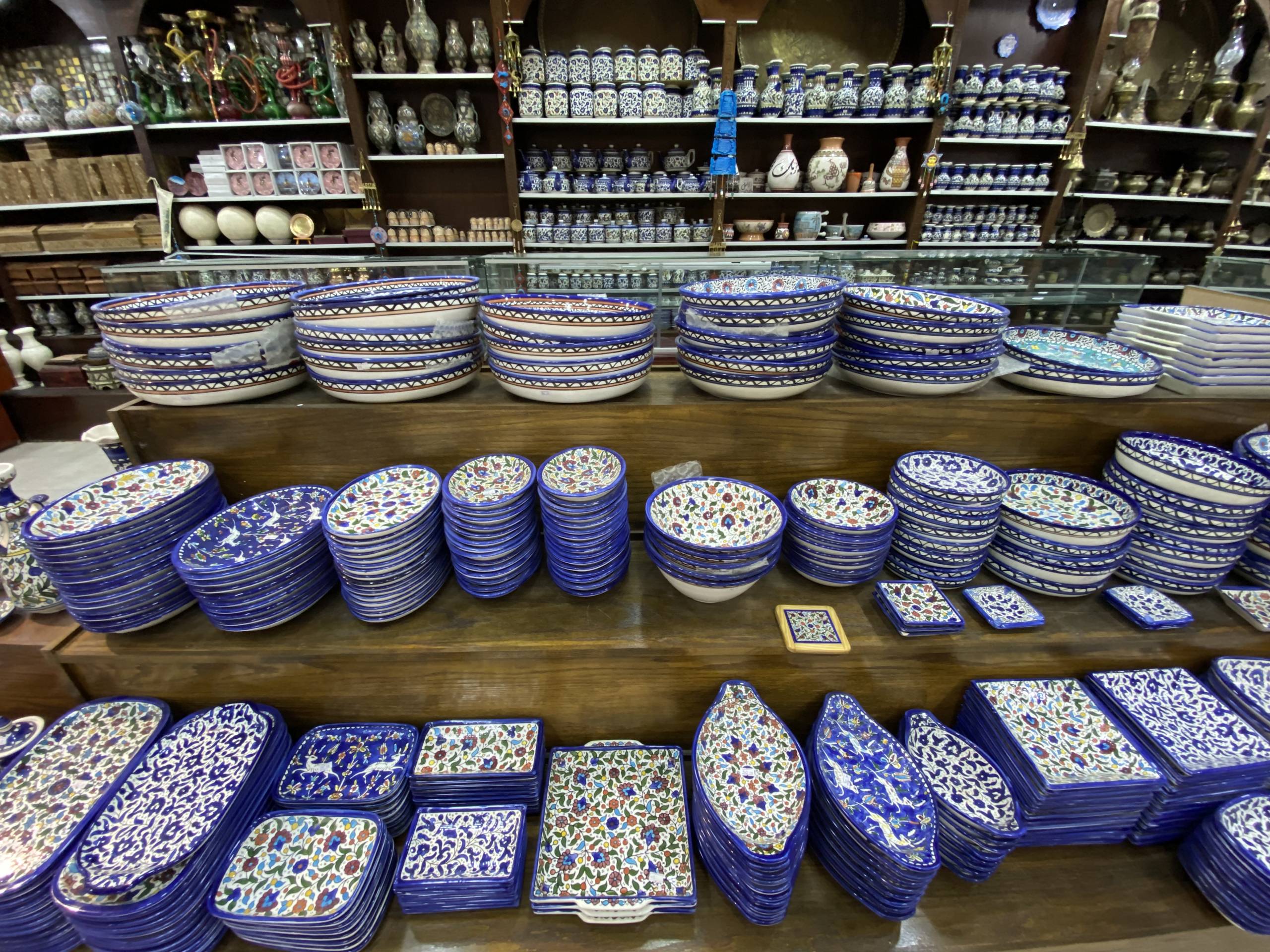 Sur la route entre Amman et Pétra, il y a quelques caravansérails qui vendent de beaux objets typiques, du mobilier en mosaïques, des vêtements, des produits de la mer Morte…