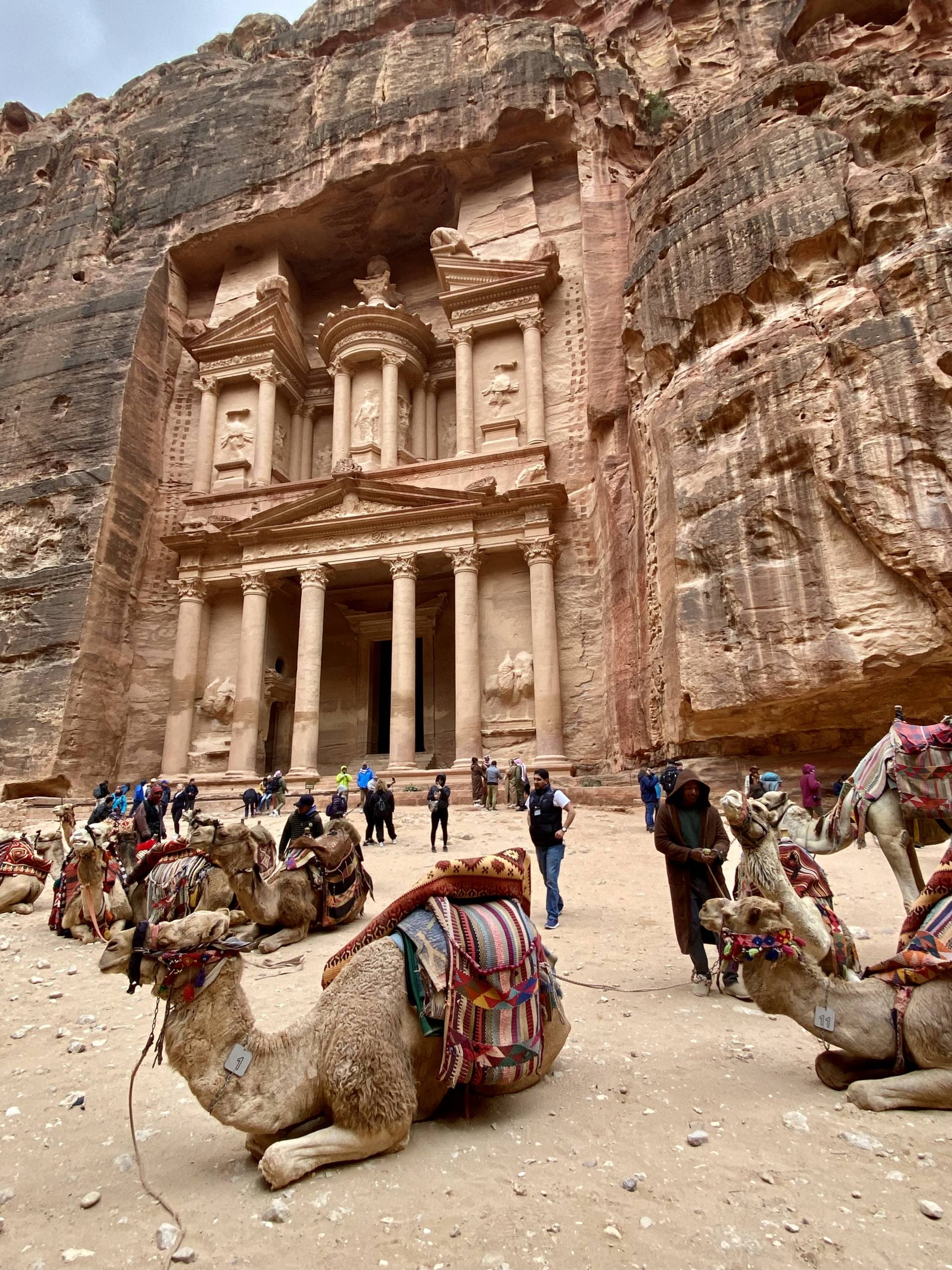 Tout commence par une déambulation dans le Siq, une descente entre les bords d’un chemin qui s’étroitise pour devenir un canyon entre les hautes roches. On y croise toutes les nationalités et aussi des ânes et des cheveux qui « remontent » des visiteurs épuisés et un balai de voiturettes électriques occupées à faire des aller-retours entre l’entrée et le trésor.